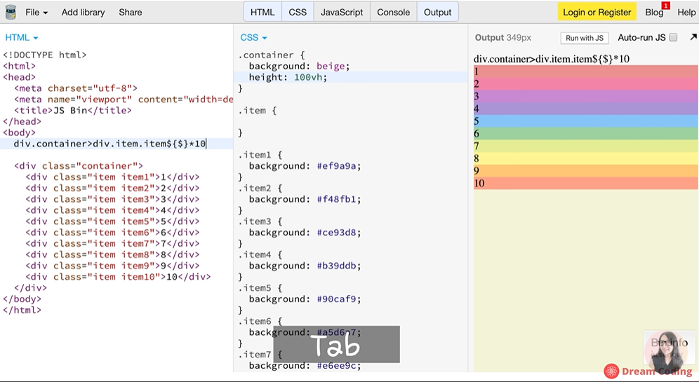 (body 바로 아래 1줄 코드) 이렇게 코드를 간단하게 적어서 한 번에 10개의 item 박스들에 번호를 지정하여 만들 수 있습니다.