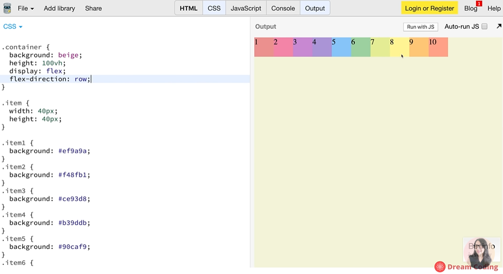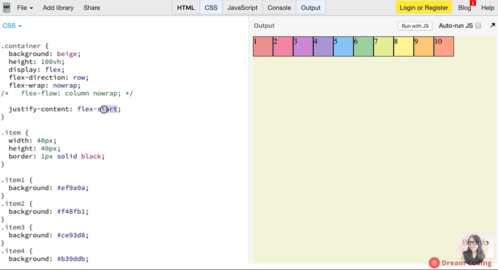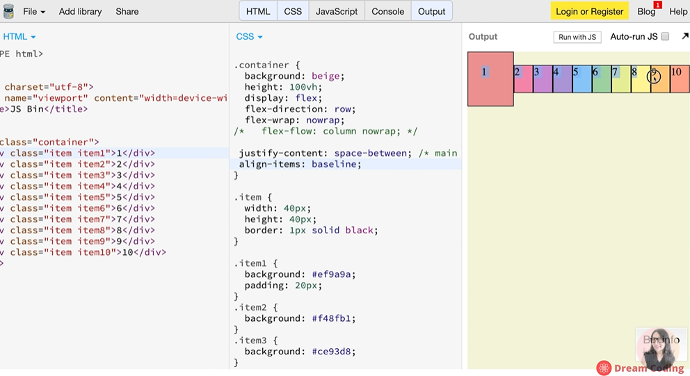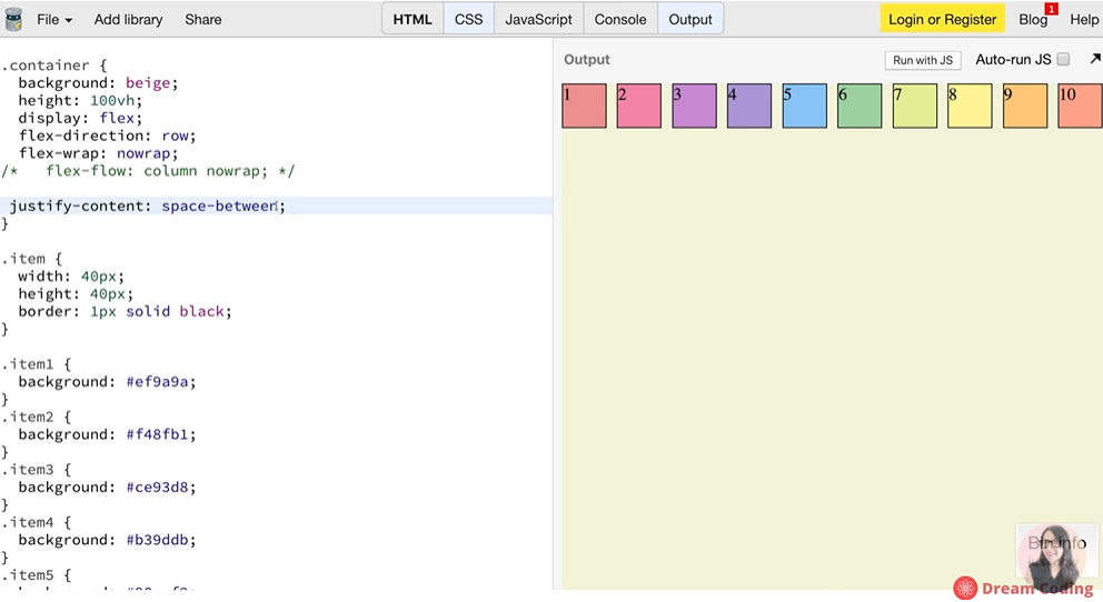 display: flex;를 입력하면 item들이 왼쪽에서 오른쪽으로 정렬됩니다.