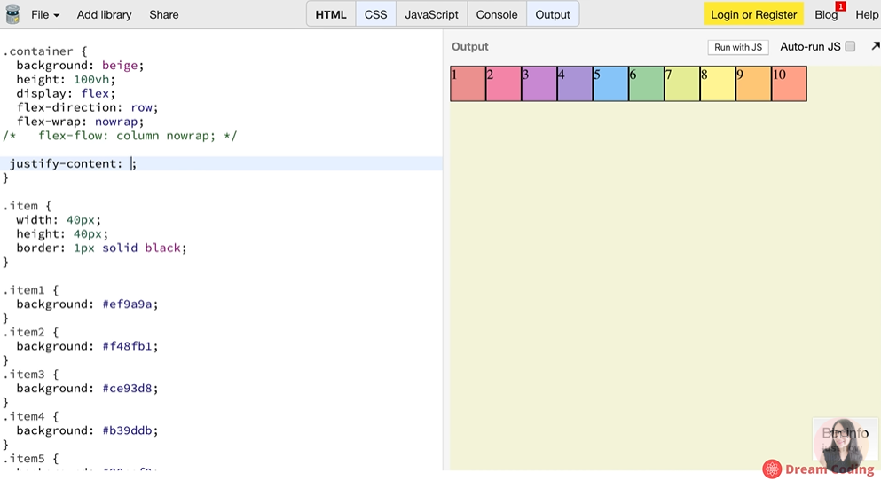 justify-content: flex-start(기본값), flex-end, center, space-around. space-evenly, space-between