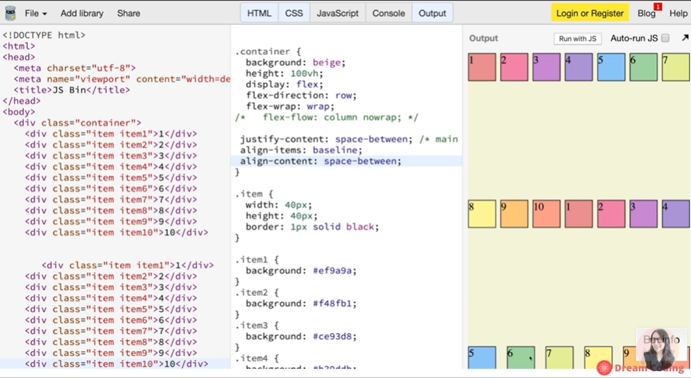 align-content: space-between 은 맨위와 맨아래는 딱 붙어 있으면서 중간의 item들과의 간격이 일정하게 생긴 것입니다.