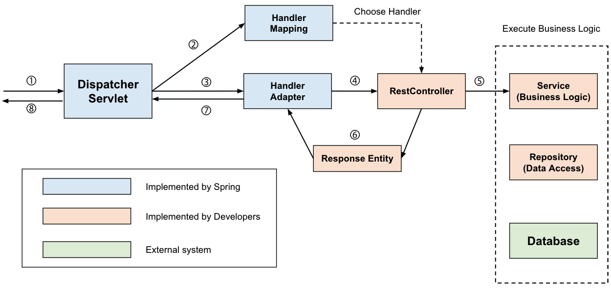 앞서 설명한대로 디스패처 서블릿은 적합한 컨트롤러와 메소드를 찾아 요청을 위임해야 합니다. Dispatcher Servlet의 처리 과정을 살펴보면 다음과 같습니다.