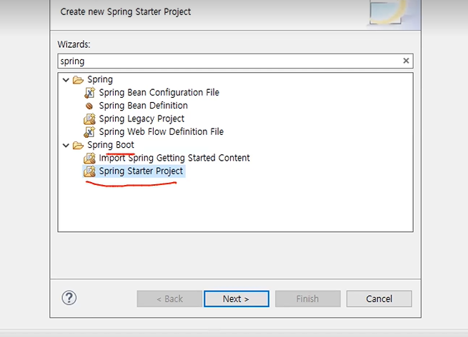팝업창이 뜨면 'Spring Boot' 아래에 'Spring starter Project' 선택 후 Next 클릭
