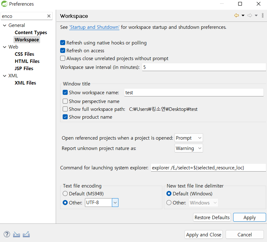 Windows - preferences에서 설정할것