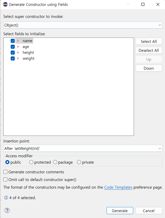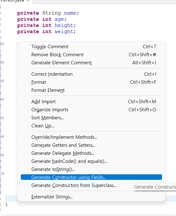 마우스 우클릭 - Source (단축키 : alt + shift + s) - Generate Constructor using Fields...클릭