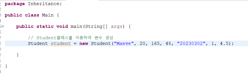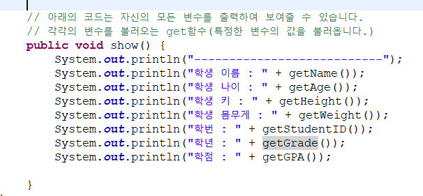 코드의 가장 아래에 보면 Student클래스에 없는 변수까지 표기되는데요, 자신의 부모인 Person클래스의 변수를 상속 받아 쓸 수 있기 때문에, Student 변수 외에 Person의 변수도 자동으로 함께 매개변수로 부여되어 사용할 수 있습니다.