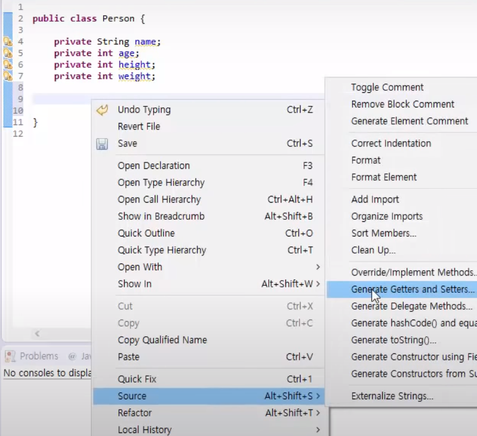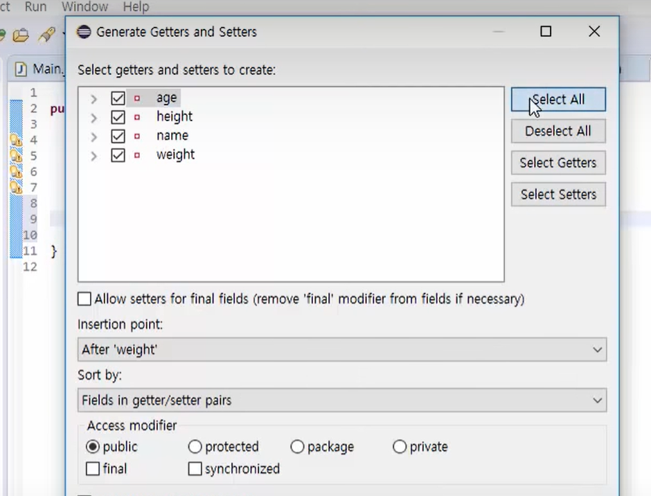 마우스 우클릭 - Source (단축키 : alt + shift + s) - Generate Getters and Setters...클릭
