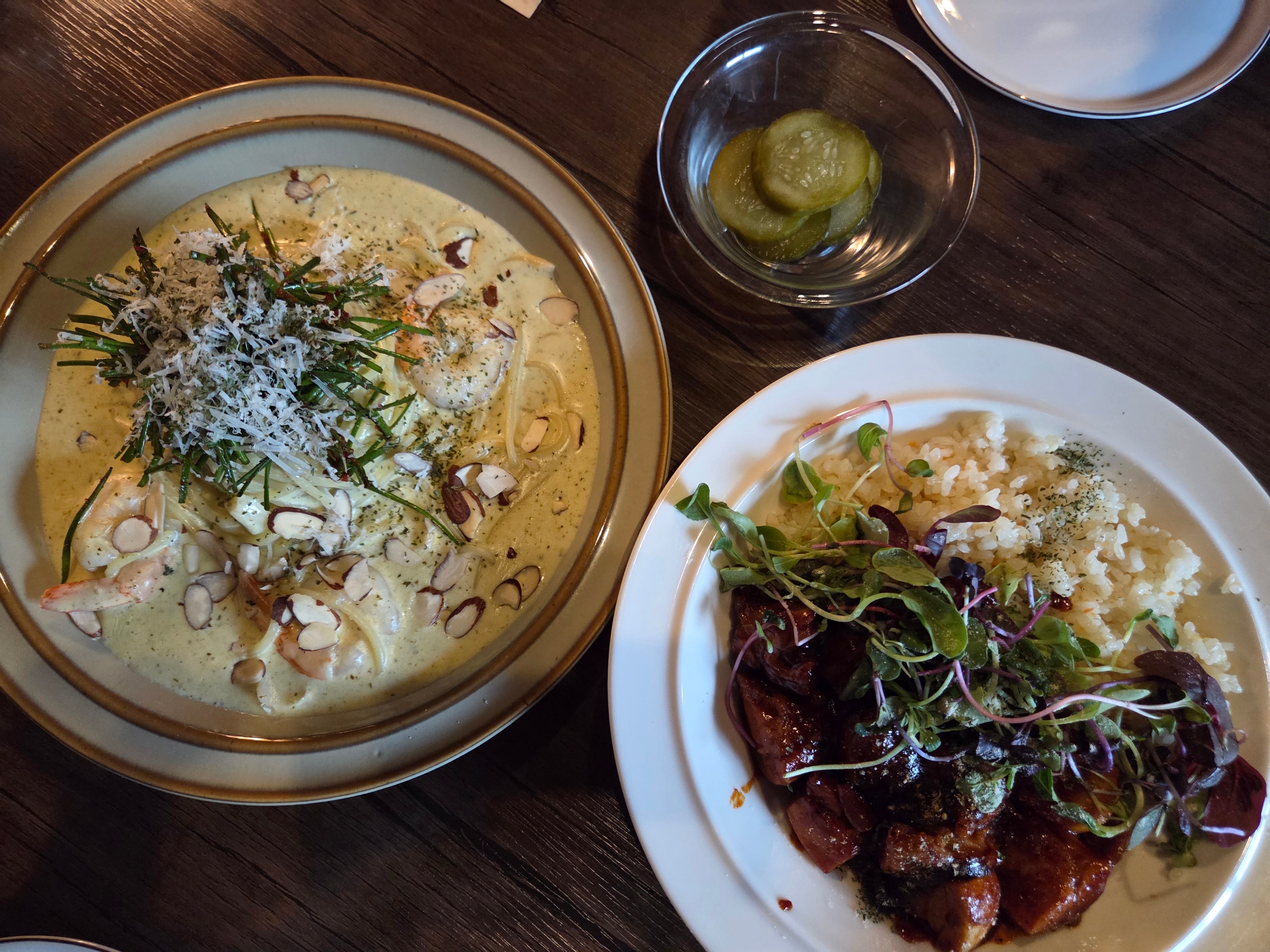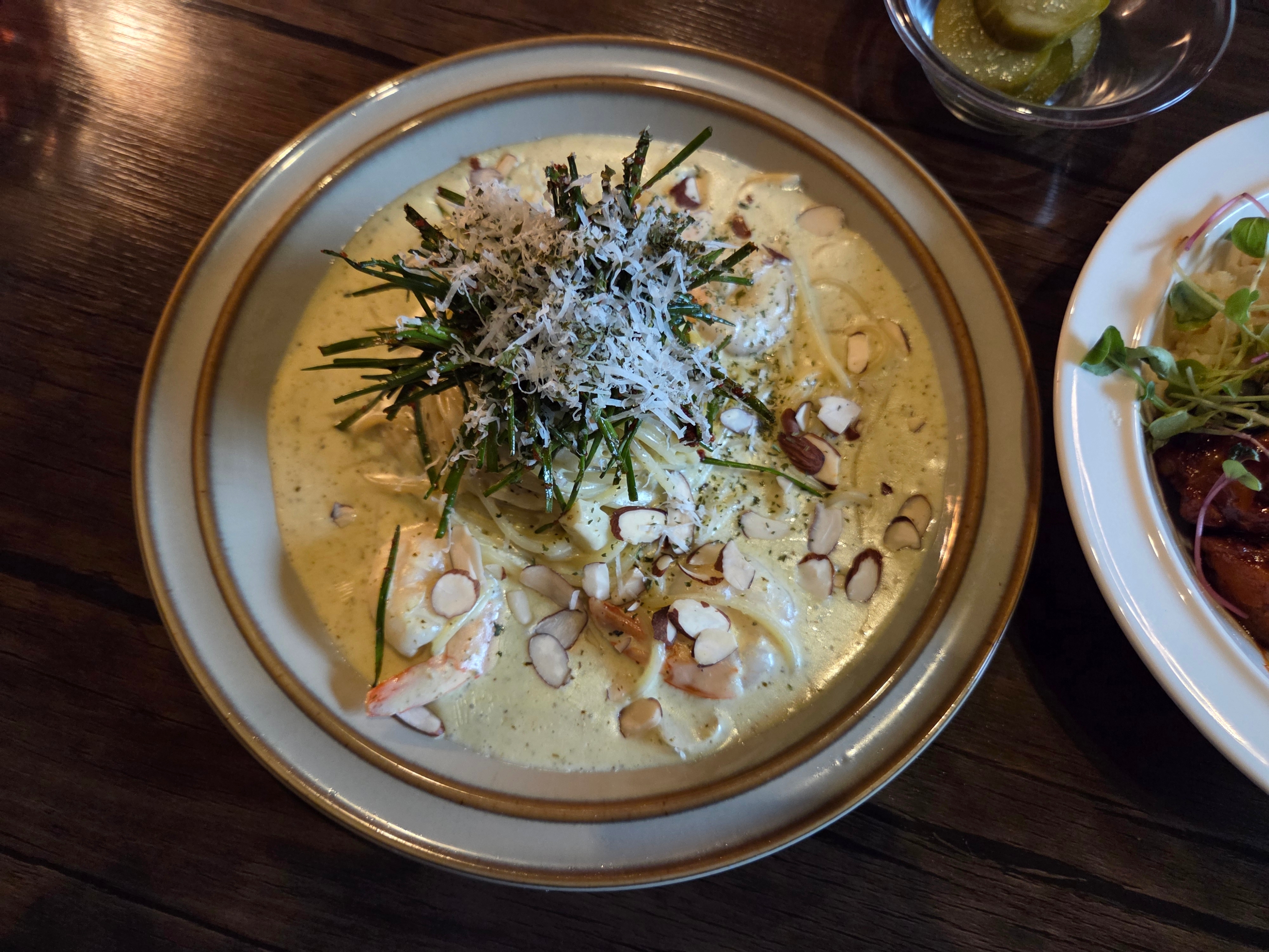 새우 바질 페스토 파스타는 적당한 꾸덕함과 부추향이 잘 느껴지는 맛이었어요.